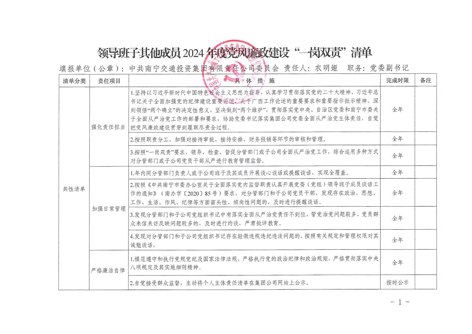 領(lǐng)導(dǎo)班子其他成員2024年度黨風(fēng)廉政建設(shè)“一崗雙責(zé)”清單(一)
